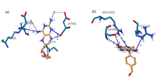 The protein-ligand interaction profiler software was used to elucidate these interactions and generate the 2D interaction diagrams. Panel A shows the binding interaction of the known inhibitor with DHFR, positioned within the enzyme’s active site and forming critical interactions with residues including ILE47A and ASP88A through hydrogen bonds and hydrophobic contacts, which stabilize the inhibitor within the binding pocket. Panel B illustrates how the natural substrate interacts with DHFR, fitting into the enzyme’s active site and forming specific interactions particularly with residues SER89A and ARG100B, which are essential for the enzyme’s normal catalytic activity. Structures were visualized and rendered using PyMOL version 2.4.0 shown in Fig 1a and b.