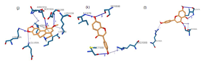 Figure 2a shows Silymarin occupying the DHFR active pocket and forming multiple stabilizing interactions with key amino acid residues, indicating strong binding stability. Figure 2b shows Anonaine interacting with active site residues through hydrogen bonding and hydrophobic contacts, supporting its favorable binding orientation. Figure 2c shows Baicalein forming specific hydrogen bonds within the catalytic region, reflecting effective positioning inside the pocket. Figure 2d shows Biochanin establishing several contacts that suggest a stable binding configuration. Figure 2e shows Butein positioned deeply within the binding site, interacting primarily through hydrogen bonds and hydrophobic effects. Figure 2f shows Naringenin adopting a compact conformation within the active cavity, engaging key residues that enhance docking stability. Figure 2g shows Genistein forming important hydrogen bonds and additional stabilizing interactions with DHFR. Figure 2h shows Kaempferol interacting at multiple binding points within the active site, indicating a strong binding pose. Figure 2i shows Luteolin establishing significant interactions with essential residues, highlighting its inhibitory potential. Figure 2j shows Nornantenine forming both hydrogen bonds and hydrophobic contacts within the pocket. Figure 2k shows Daidzein fitting appropriately into the binding cavity and forming stabilizing interactions. Figure 2l shows Apigenin forming targeted hydrogen bonds within the active site, suggesting structural compatibility and potential inhibitory activity.
